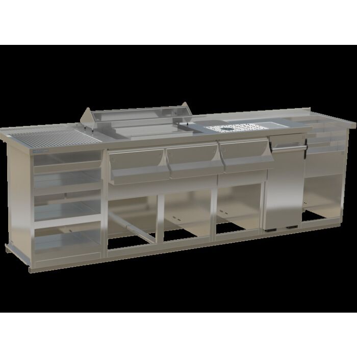 Cocktailstation: Arbeitsplatte mit zwei Tropfmulden und Prismen-Lochplatten, Schneidbrett und Gläserdruckspüler, zwei untergesetzte isolierte Wannen mit Schiebedeckeln, Lochblechen und Trennwänden, zwei Becken mit gelochten Einsätzen, zwei Aufsatzboards für 4 x GN 1/9