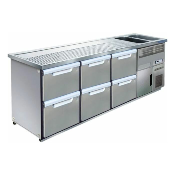 - Kühlkorpus bestehend aus drei Abteilen 550 mm, mit zwei Mittelstegen 110 mm und 6 Schubladen