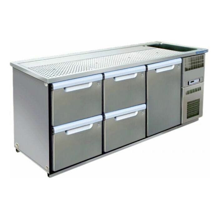 - Kühlkorpus bestehend aus drei Abteilen 550 mm, mit zwei Mittelstegen 110 mm und 1 Tür wahlweise mit höhenverstellbaren Rosten oder Faßschienen und 4 Schubladen