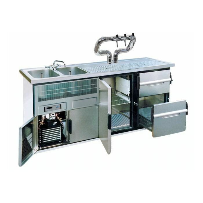 - 1 Tür wahlweise mit höhenverstellbaren Rosten oder Faßschienen und 2 Schubladen.