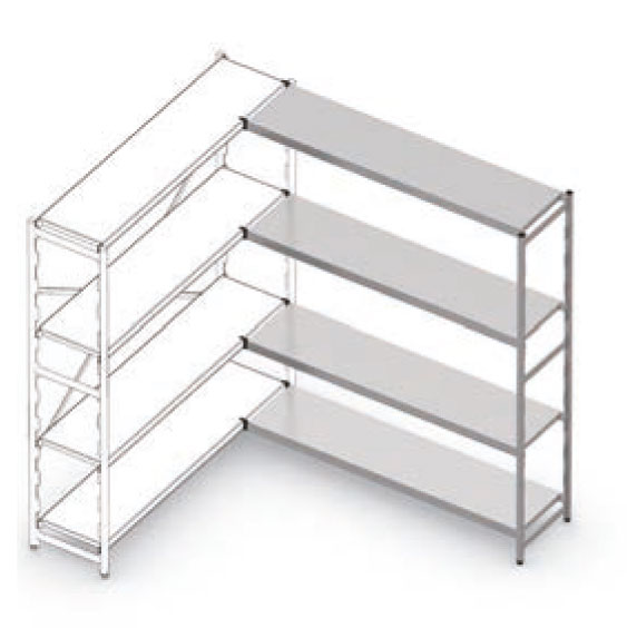 Die 90°-Übereckbauweise erfolgt mittels für jedes Regalsystem lieferbare Eckverbindungsklammern (2 Stück je Auflage). Kein überflüssiger Regalständer erforderlich.
