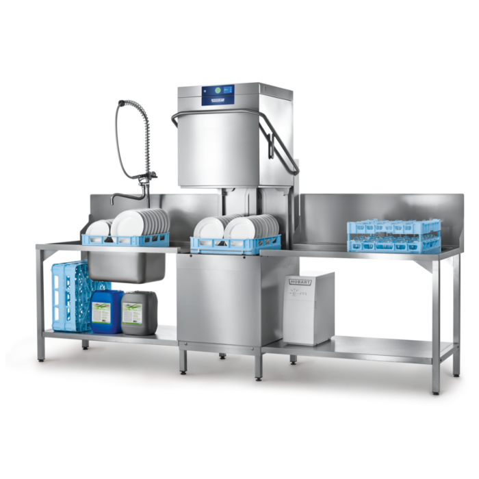 * Um das Erreichen hygienischer Klarspültemperaturen auch bei Kaltwasseranschluss zu gewährleisten, besitzt die Maschine eine automatische Programmzeitverlängerung. Bei Eckaufstellung empfehlen wir, dass die rechte Seite der Maschine für die Wartung zugänglich ist. Ab einer Wasserhärte von 3°dH empfehlen wir eine HOBART Wasseraufbereitung.