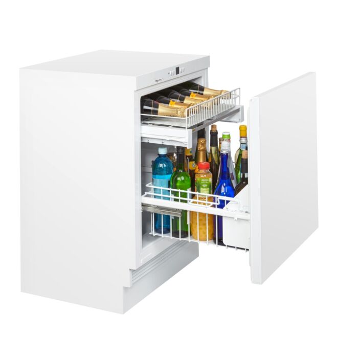- Im unteren Flaschenkorb sind alle Flaschen gut sortiert und griffbereit zur Hand, auch offene Getränke mit Kronenverschluss oder Korken stehen „auslaufsicher“.