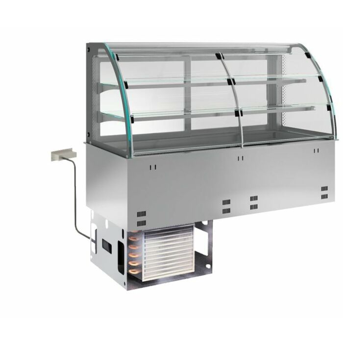 Umluft-Einbaukühlvitrine mit gebogenem Glasaufbau. Die Seitenscheiben sind aus 10 mm, die Zahlplatte aus 6 mm sowie die Glaszwischenetagen aus 8 mm starkem Glas gefertigt. Kundenseitig befinden sich Selbstbedienungsklappen aus Plexiglas mit Griff für die leichte Entnahme der präsentierten Waren. Bedienerseitig ist die Vitrine mit zwei 14 mm starken Isolierglas-Schiebetüren, die mit einem CNS Rahmen versehen sind, ausgestattet. Im oberen Bereich des Vitrinenaufbaues befindet sich die Innenbeleuchtung. Das Gerät ist mit einer elektronischen Steuerung mit digitaler Temperaturanzeige sowie Ein-/Ausschalter für Beleuchtung ausgerüstet. Um die Steuerung der Umluftplatte auch nach dem Einbau zu gewährleisten, kann die Steuereinheit bis zu 200 mm herausgezogen werden um diese in einen bauseitigen Korpus einzubauen. Der beschichtete Verdampfer kann einfach hochgeklappt werden um eine hygienische Reinigung der Wanne zu gewährleisten. Das anfallende Tauwasser ist durch einen bauseitigen Abwasseranschluss zu entsorgen, optional gegen Mehrpreis kann werkseitig eine elektrische Tauwasserverdunstung eingebaut werden. Die Anschlüsse für den Tauwasserablauf befinden sich unter dem Gerät. Das Gerät kann mit GN-Behälter mit einer Tiefe von max. 30 mm bestückt werden. Behälter sind nicht im Lieferumfang enthalten.
