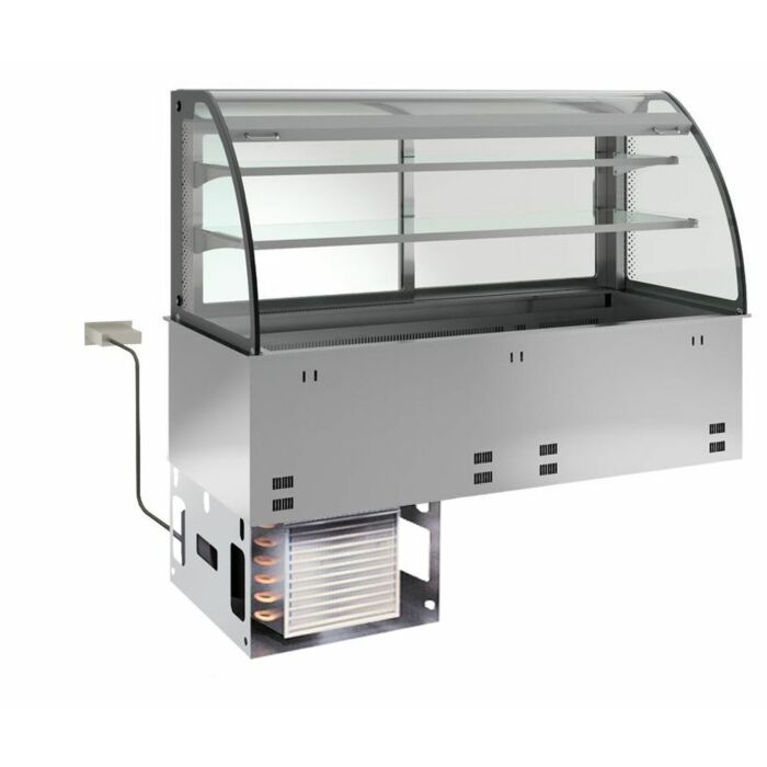 Umluft-Einbaukühlvitrine mit gebogenem Glasaufbau. Die Seitenscheiben sind aus 10 mm, die Zahlplatte aus 6 mm sowie die Glaszwischenetagen aus 8 mm starkem Glas gefertigt. Kundenseitig ist das Gerät offen und für die Reduzierung des Energieverbrauches mit einem Nachtrollo versehen, der nach Geschäftsschluss manuell geschlossen werden kann. Bedienerseitig ist die Vitrine mit zwei 14 mm starken Isolierglas-Schiebetüren, die mit einem CNS Rahmen versehen sind, ausgestattet. Die Schiebetüren sind mit einem speziellen Luftleitkanal ausgerüstet um die Kühlung zu optimieren. Im oberen Bereich des Vitrinenaufbaues befinden sich die Innenbeleuchtung und der manuelle Nachtrollo. Das Gerät ist mit einer elektronischen Steuerung mit digitaler Temperaturanzeige sowie Ein-/Ausschalter für Beleuchtung ausgerüstet. Um die Steuerung der Umluftplatte auch nach dem Einbau zu gewährleisten, kann die Steuereinheit bis zu 200 mm herausgezogen werden um diese in einen bauseitigen Korpus einzubauen. Der beschichtete Verdampfer kann einfach hochgeklappt werden um eine hygienische Reinigung der Wanne zu gewährleisten. Das anfallende Tauwasser ist durch einen bauseitigen Abwasseranschluss zu entsorgen, optional gegen Mehrpreis kann werkseitig eine elektrische Tauwasserverdunstung eingebaut werden. Die Anschlüsse für den Tauwasserablauf befinden sich unter dem Gerät. Das Gerät kann mit GN-Behälter mit einer Tiefe von max. 30 mm bestückt werden. Behälter sind nicht im Lieferumfang enthalten.