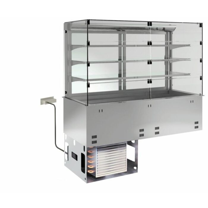 Umluft-Einbaukühlvitrine mit geradem Glasaufbau. Die Seitenscheiben sind aus 10 mm, die Zahlplatte aus 6 mm sowie die Glaszwischenetagen aus 8 mm starkem Glas gefertigt. Kundenseitig befinden sich Selbstbedienungsklappen aus Plexiglas mit Griff für die leichte Entnahme der präsentierten Waren. Bedienerseitig ist die Vitrine mit zwei 14 mm starken Isolierglas-Schiebetüren, die mit einem CNS Rahmen versehen sind, ausgestattet. Im oberen Bereich des Vitrinenaufbaues befindet sich die Innenbeleuchtung. Das Gerät ist mit einer elektronischen Steuerung mit digitaler Temperaturanzeige sowie Ein-/Ausschalter für Beleuchtung ausgerüstet. Um die Steuerung der Umluftwanne auch nach dem Einbau zu gewährleisten, kann die Steuereinheit bis zu 200 mm herausgezogen werden um diese in einen bauseitigen Korpus einzubauen. In der Umluftwanne befindet ein Einlegeboden der von 30 mm bis 150 mm höhenverstellt werden kann. Der beschichtete Verdampfer kann einfach hochgeklappt werden um eine hygienische Reinigung der Wanne zu gewährleisten. Das anfallende Tauwasser ist durch einen bauseitigen Abwasseranschluss zu entsorgen, optional gegen Mehrpreis kann werkseitig eine elektrische Tauwasserverdunstung eingebaut werden. Die Anschlüsse für den Tauwasserablauf befinden sich unter dem Gerät. Das Gerät kann mit GN-Behälter mit einer Tiefe von max. 150 mm bestückt werden. Behälter sind nicht im Lieferumfang enthalten.
