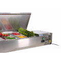 Kühlaufsatz mit klappbaren CNS-Deckel. Elektronische Digitalsteuerung mit visueller Alarmanzeige, sowie Anzeige des Kühl-/Abtauvorganges. Beleuchteter Ein-/Ausschalter. Eingeschäumter Verdampfer. Maschine rechts (bedienerseitig) angeordnet. GN-Schalen nicht im Lieferumfang enthalten.