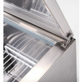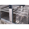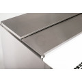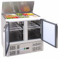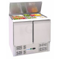 Saladette mit 3-seitig eingeschäumtem Verdampfer. Isolierung 45 mm; dadurch geringerer Energieverbrauch. Temperatur mittels elektronischem Thermostat regelbar. Digitale Temperaturanzeige. Beleuchteter Ein-/Ausschalter. Der Fettfilter befindet sich hinter der abschließbaren Maschinenblende, ist leicht herausnehmbar und waschbar. Rostmaß GN 1/1. Maximal können 5 Roste inkl. 5 Paar kippsichere Auflageschienen (Zubehör) pro Türfach eingebracht werden. Für eine optimale Luftführung im Kühltisch befindet sich im Bodenbereich hinter jeder Tür ein zusätzlicher Rost. Türdichtungen servicefreundlich ohne Werkzeug wechselbar. Schneidbrett aus Polyethylen, Boden als Wanne ausgebildet und konisch zulaufend, mittig Tauwasserablauf. Lieferung ohne GN-Behälter.