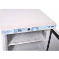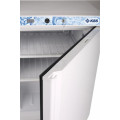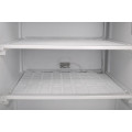 Gewerbetiefkühllagerschrank mit zwangsbelüftetem Kondensator im Maschinenraum. Der fugenlose Kunststoff-Innenbehälter ist leicht zu reinigen. Die Tür mit durchgehender Griffleiste ist abschließbar und mit einer Magnetsteckdichtung versehen, somit servicefreundlich ohne Werkzeug wechselbar. Das manuelle Thermostat und die digitale Temperaturanzeige sind in der Frontblende integriert. Vorn 2 höhenverstellbare Füße, hinten 2 Rollen.