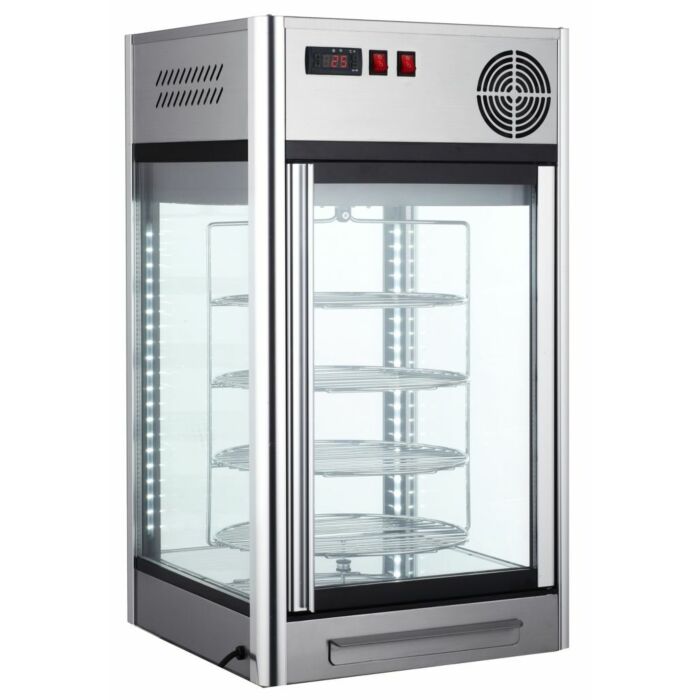 Steckerfertige Umlufttischkühlvitrine mit 2 vertikale LED Linien, Kundenseitig an der linken und rechten Innensäule, 4 seitige Doppelverglasung. Bedienerseitig ist elektronische Steuerung mit digitaler Temperaturanzeige sowie der Schalter für die Beleuchtung in der oberen Frontblende integriert. Das rotierende Innengestell ist mit 4 aus CHR bestehenden Rosten ausgestattet mit einer von 135 mm zueinander und einem Rostdurchmesser von 350 mm (davon 340 mm Nutzbar) und separat ein-/ausschaltbar. Die Tauwasserauffangwanne für das Schwitzwasser des inneren Türrahmen befindet sich bedienerseitig in der Sockelblende, durch einfaches herausziehen der Wanne kann das Tauwasser bauseits entsorgt werden. Das Gerät steht auf 4 höhenverstellbaren Füßen. Bitte beachten Sie bei dem bestücken der Vitrine auf eine einwandfreie Luftzirkulation. Keine Lagervitrine.