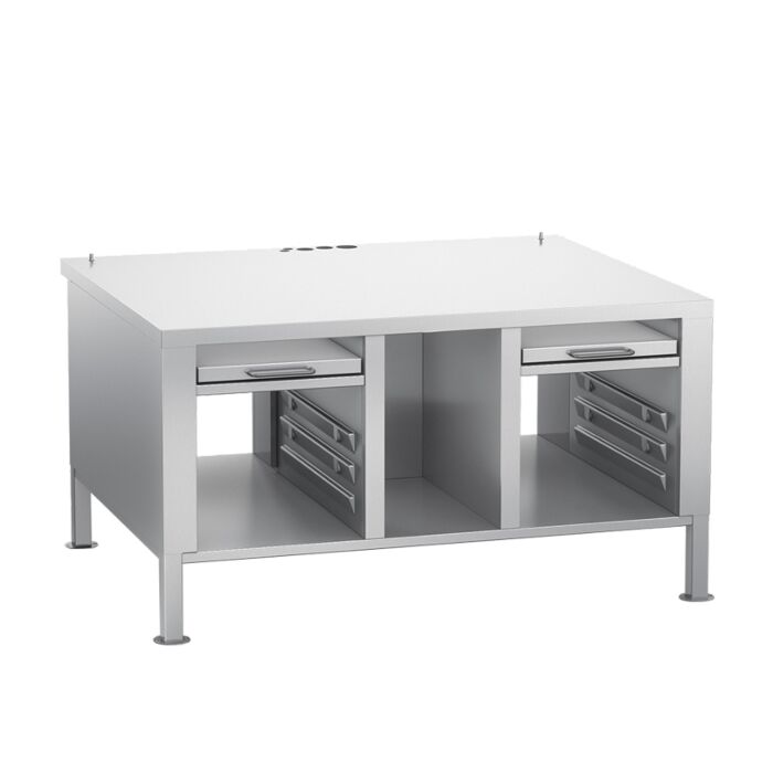 Das iVario kann direkt auf einem passenden Untergestell installiert werden. Sie profitieren damit von den integrierten Auszügen. Dort können Behälter abgestellt und der Tiegel gefahrlos entleert werden. Darunter befinden sich jeweils drei Auflageschienen zum Verstauen von GN-Behältern und Zubehör.