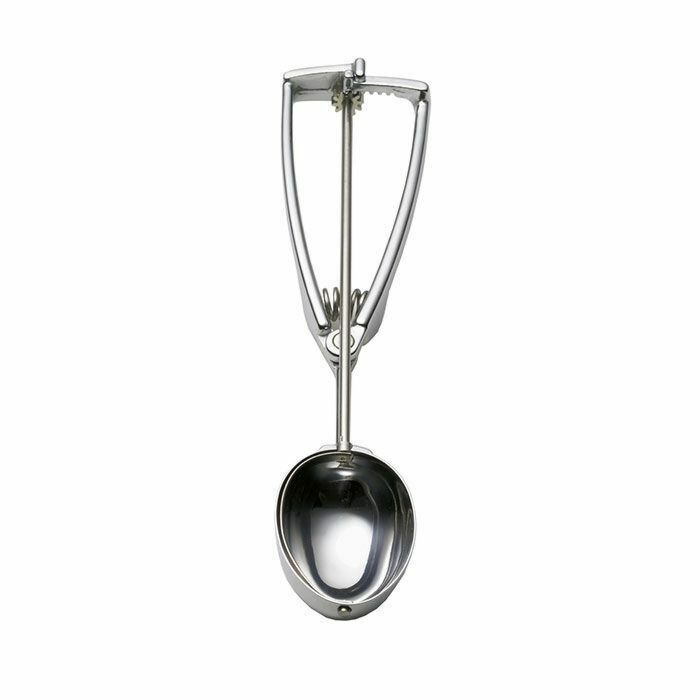 Der Eisportionierer Modell CO wird mit einer ovalen Schale aus Edelstahl 18/10 und verchromten massivem Messinggriff gefertigt. Die hochwertigen Materialien garantieren eine lange Lebensdauer.