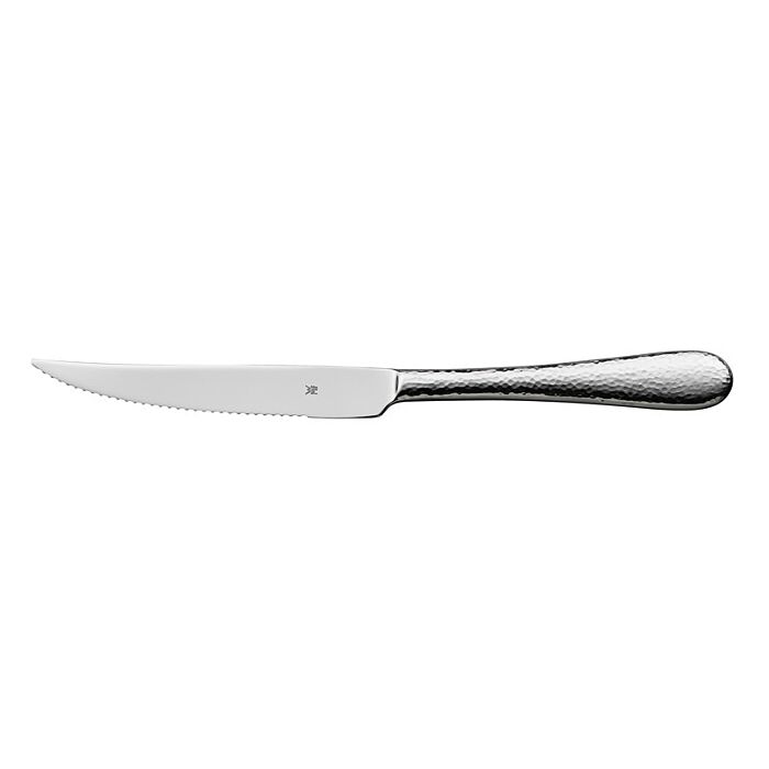 Die Kollektion SITELLO von WMF Professional vereint traditionelle Formen mit einer modernen Oberflächenveredelung. Das herausragende Merkmal ist die beidseitige Hammerschlag-Optik, die jedem Besteckteil einen individuellen Charakter verleiht. Trotz der markanten Struktur bleibt die Linienführung harmonisch ausbalanciert und basiert auf einer klassischen Rundstielform, die einen fließenden Übergang zu Laffen und Klingen schafft.